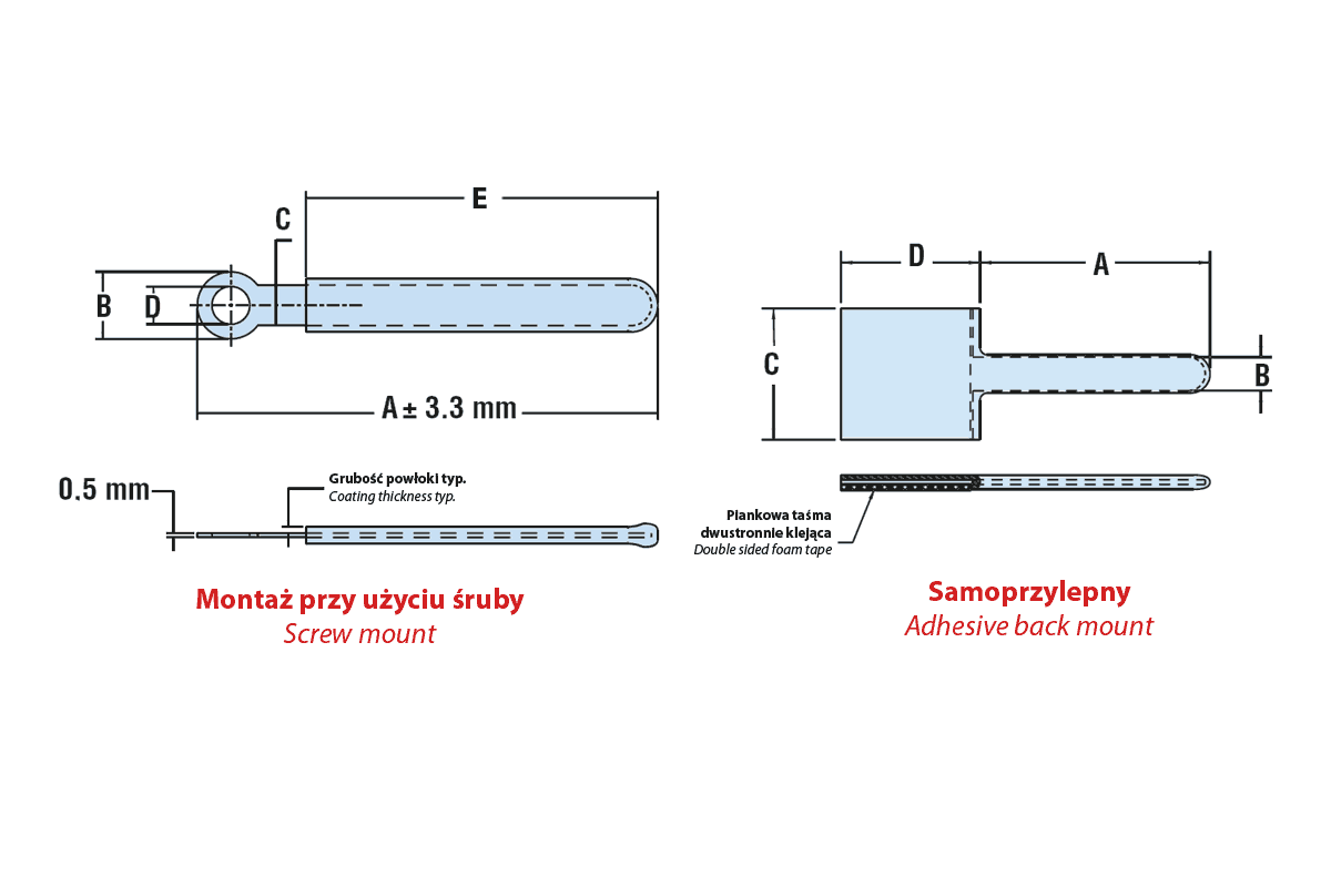 | Symbol | A | B | C | D | E | Typ/Type | Materiał |