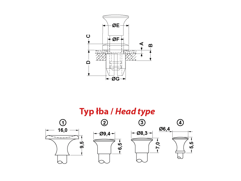 | Symbol | A | B | C | D | ØE | ØF | ØG | Kołek / Pin | Łeb / Head | Material | Flammability | Color |